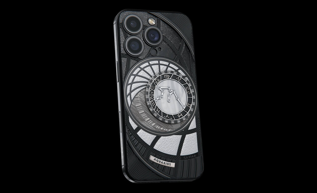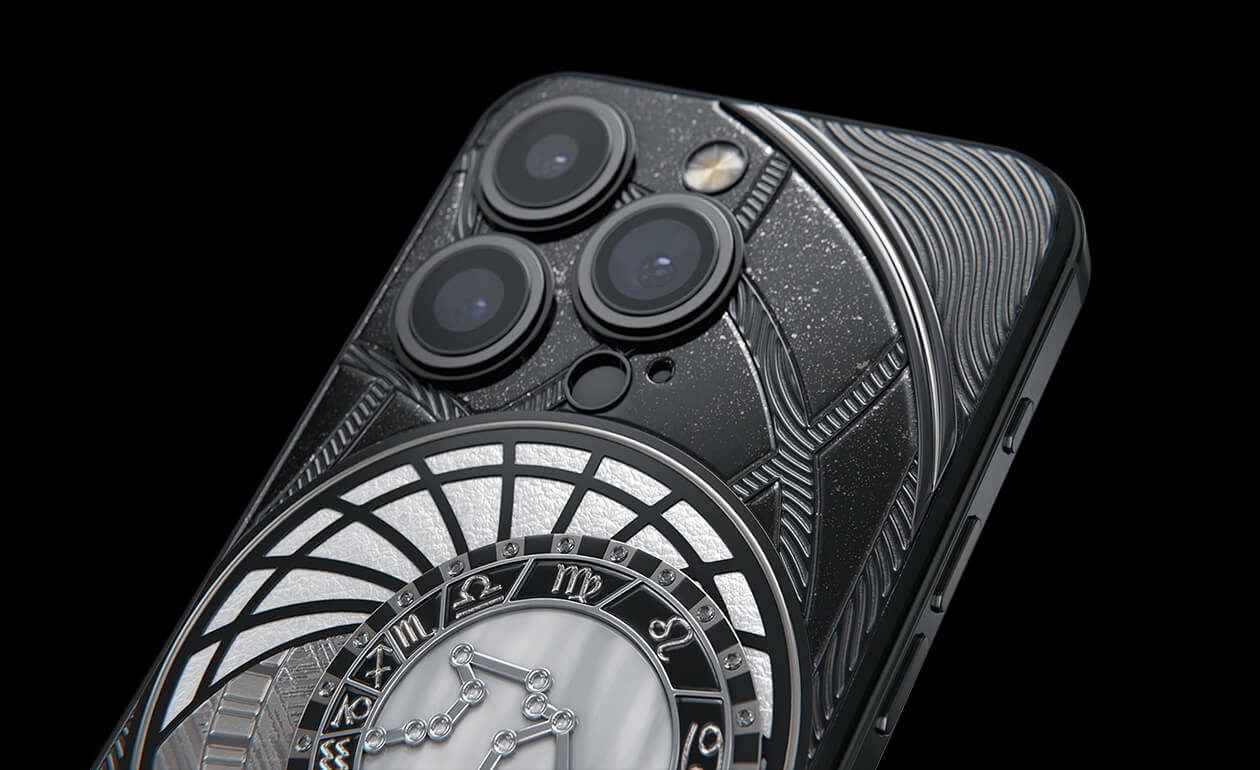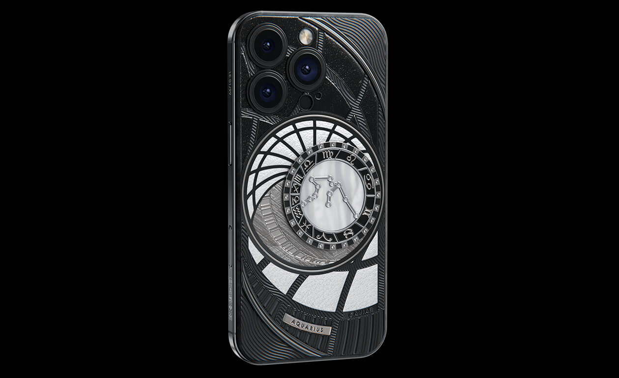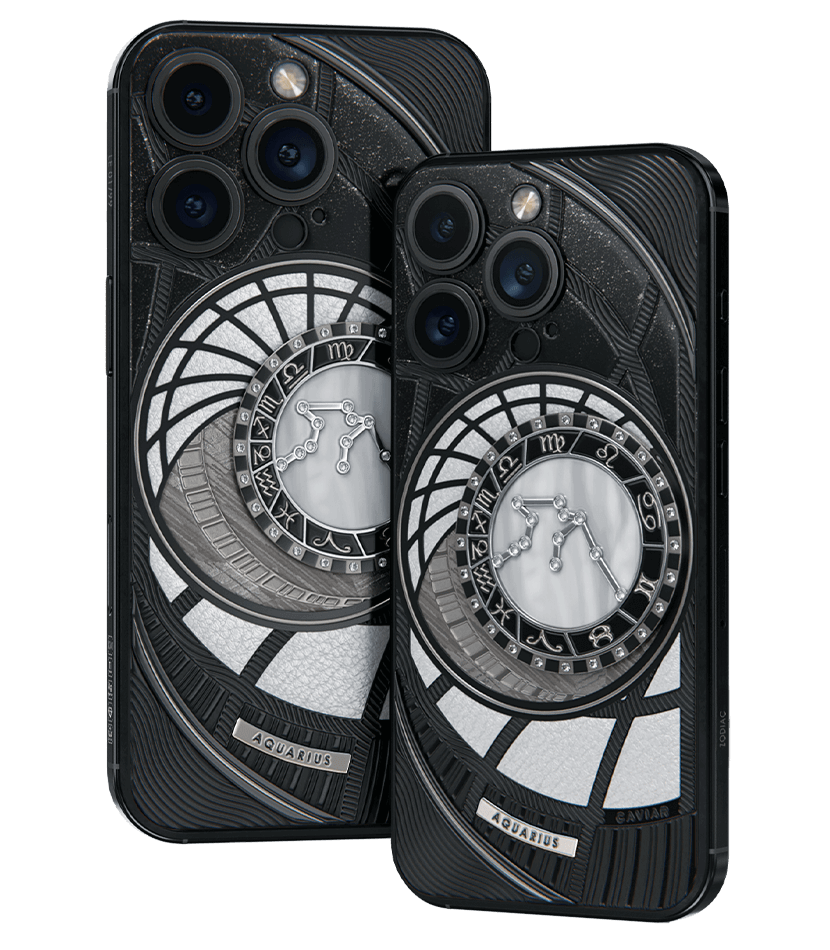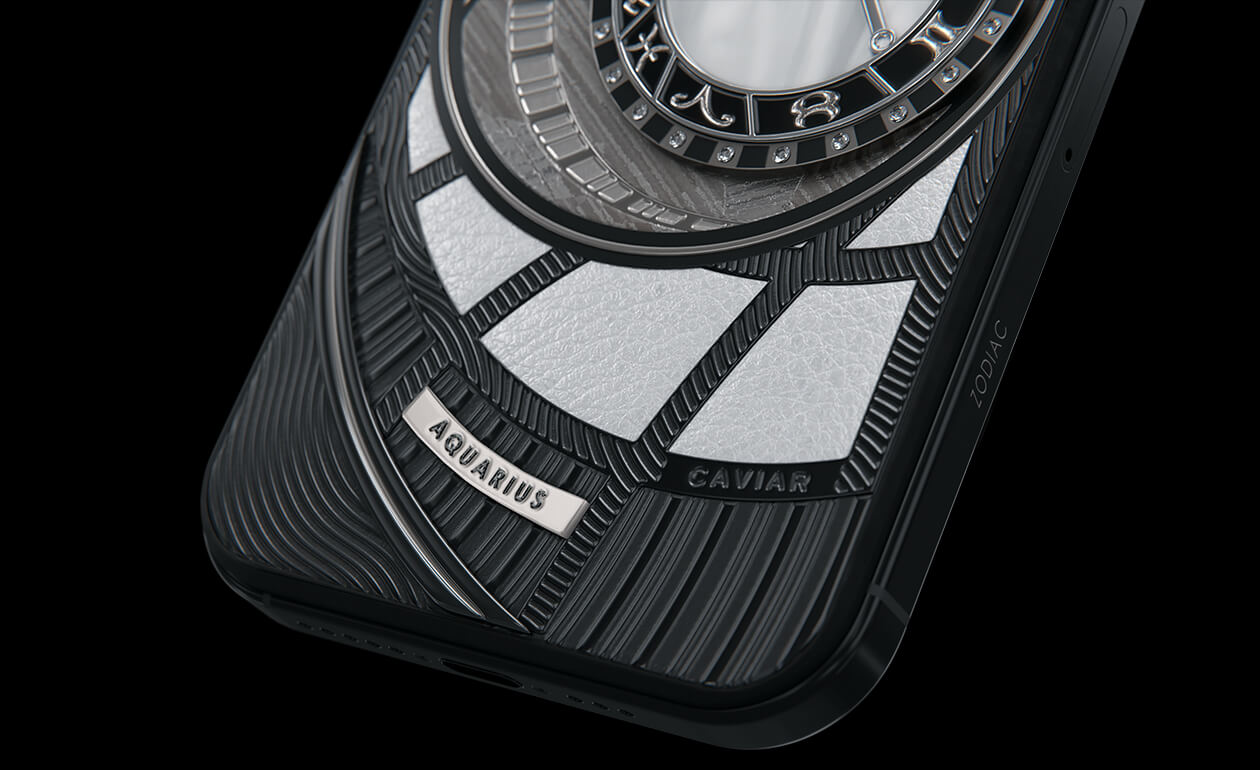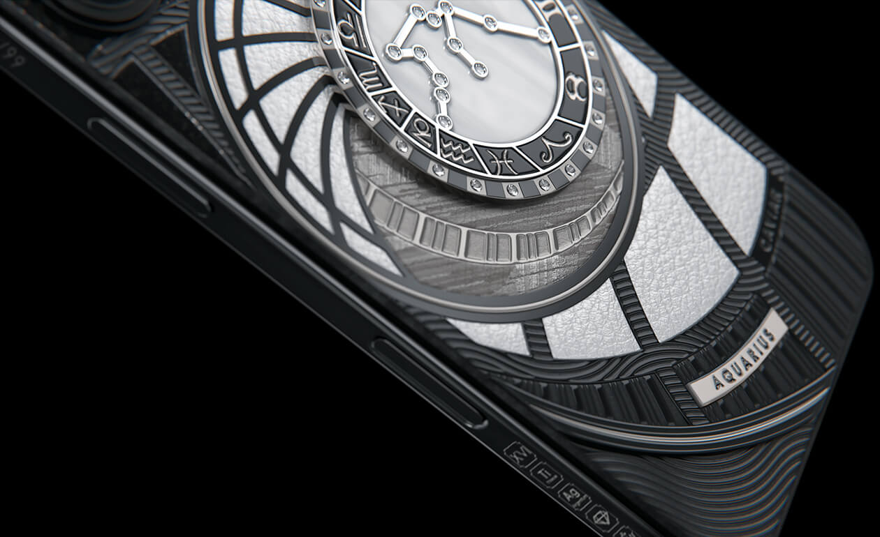 Aquariuses, today we present to you Aquarius. Your smartphone has a sky vault with your stars on it. This is a panel of 24 Swarovski crystalls, created on black titanium with a PVD coating. We highlighted the shine of the diamond placer with a white composite plate and finished the composition with a meteorite fragment on white calf leather.