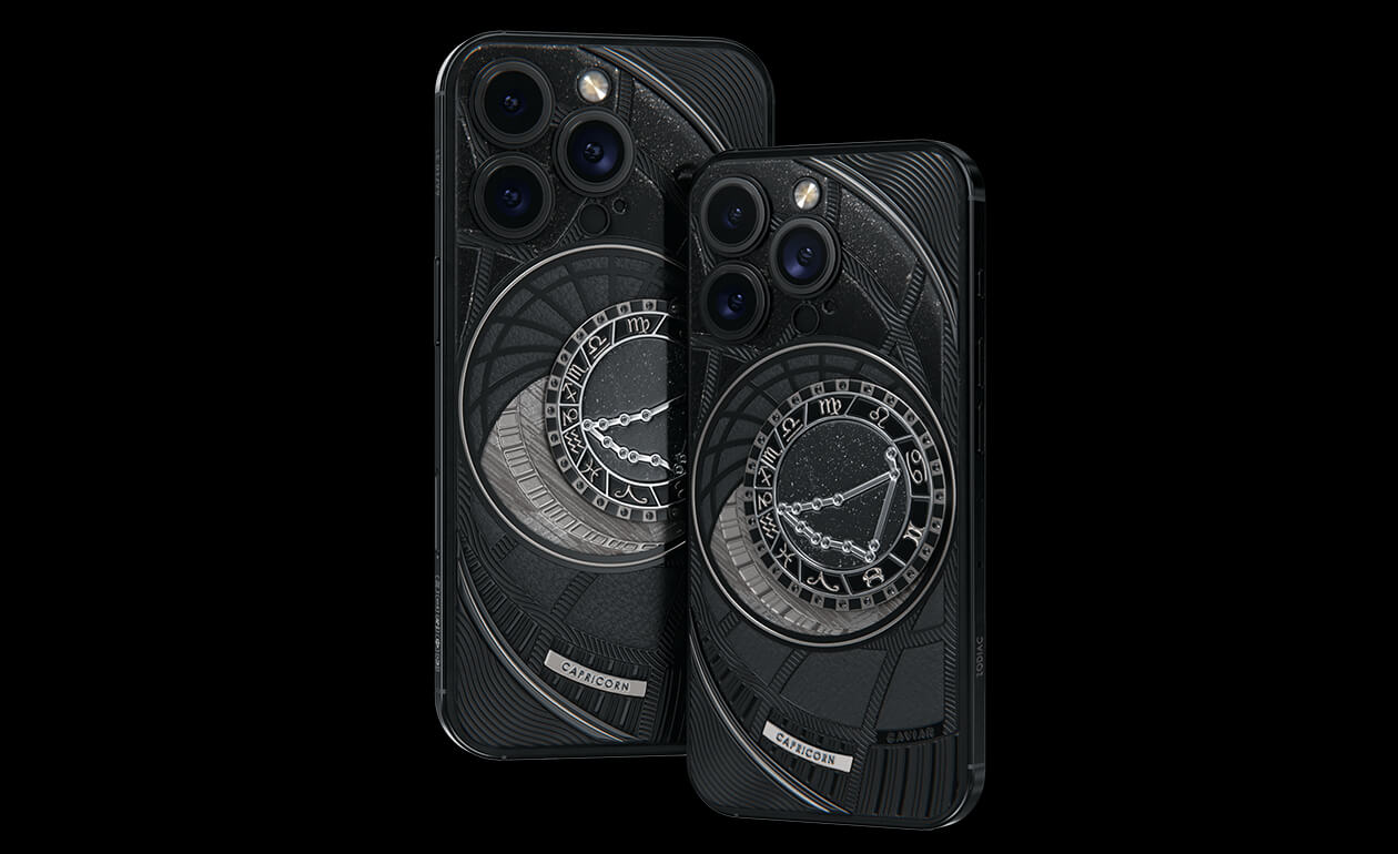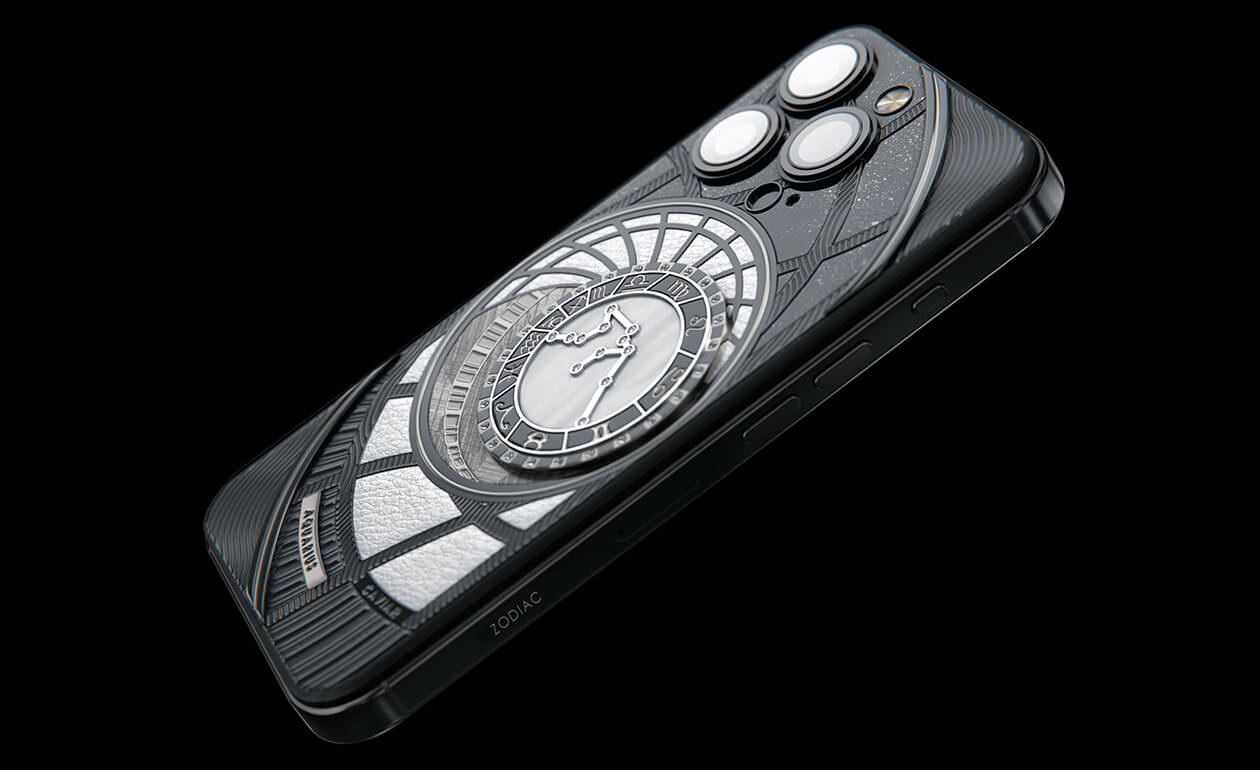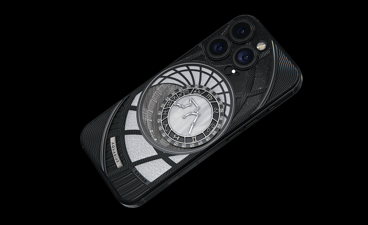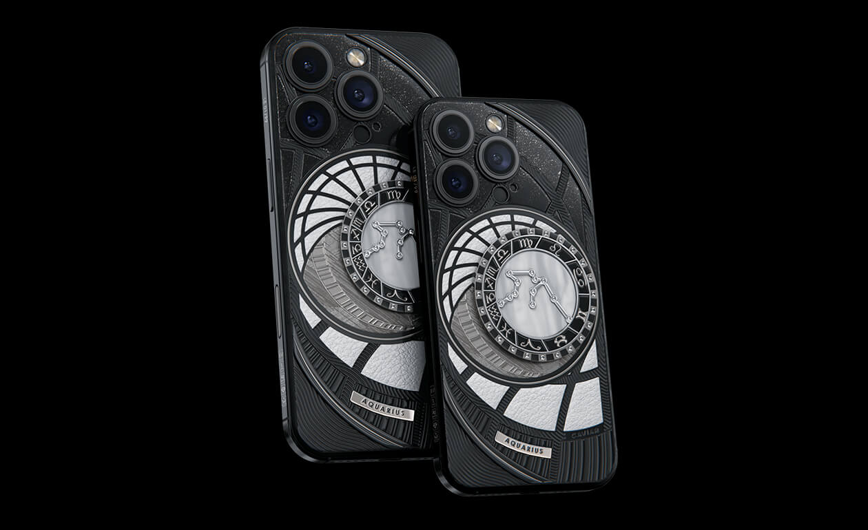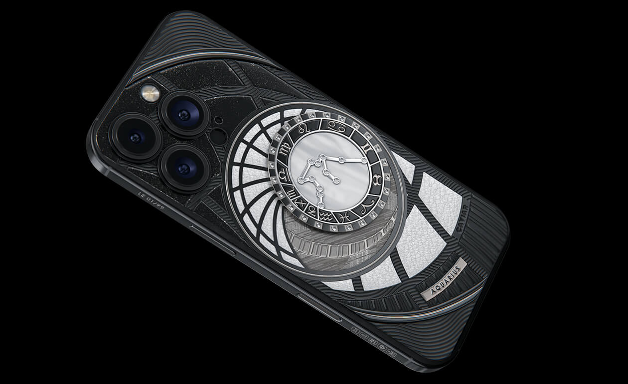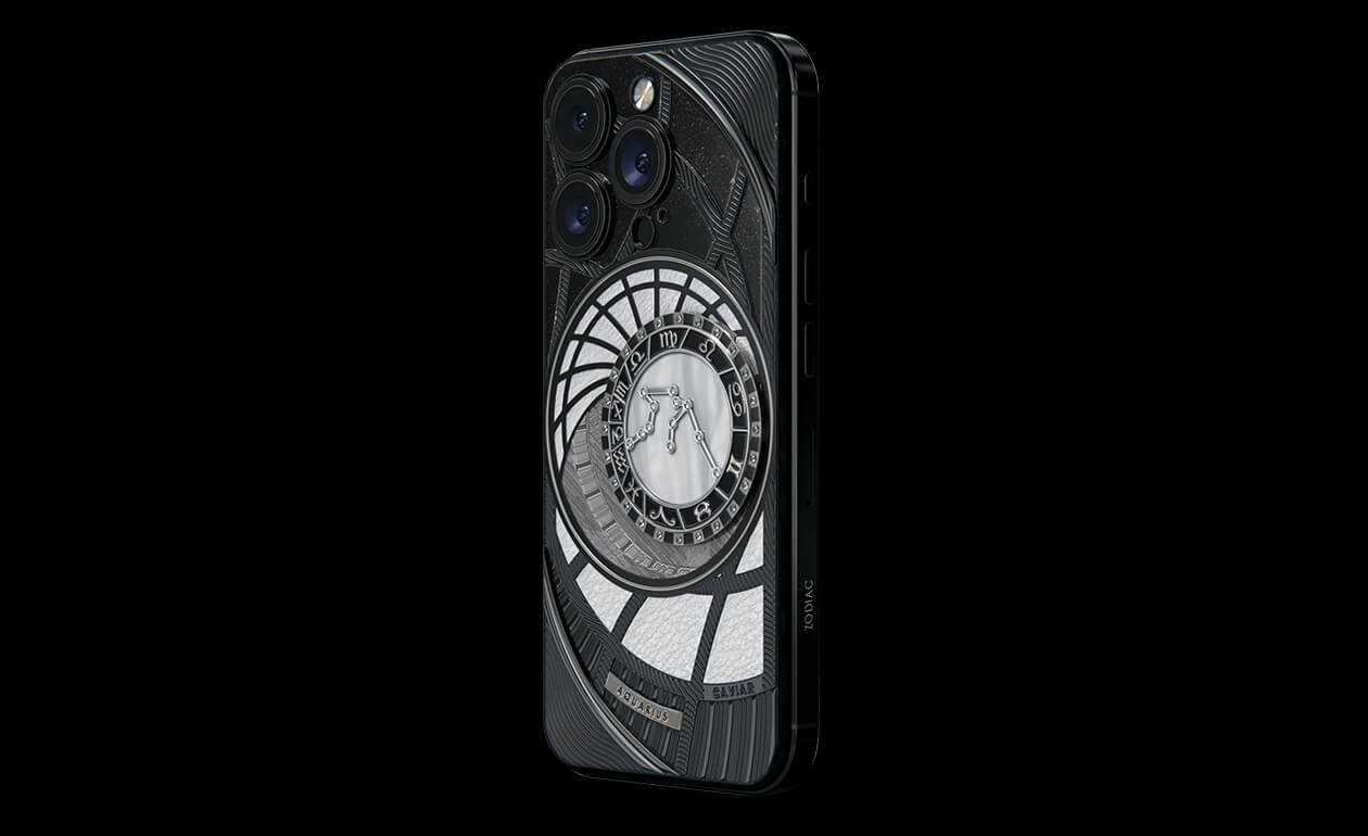 Aquariuses, today we present to you Aquarius. Your smartphone has a sky vault with your stars on it. This is a panel of 24 Swarovski crystalls, created on black titanium with a PVD coating. We highlighted the shine of the diamond placer with a white composite plate and finished the composition with a meteorite fragment on white calf leather.
