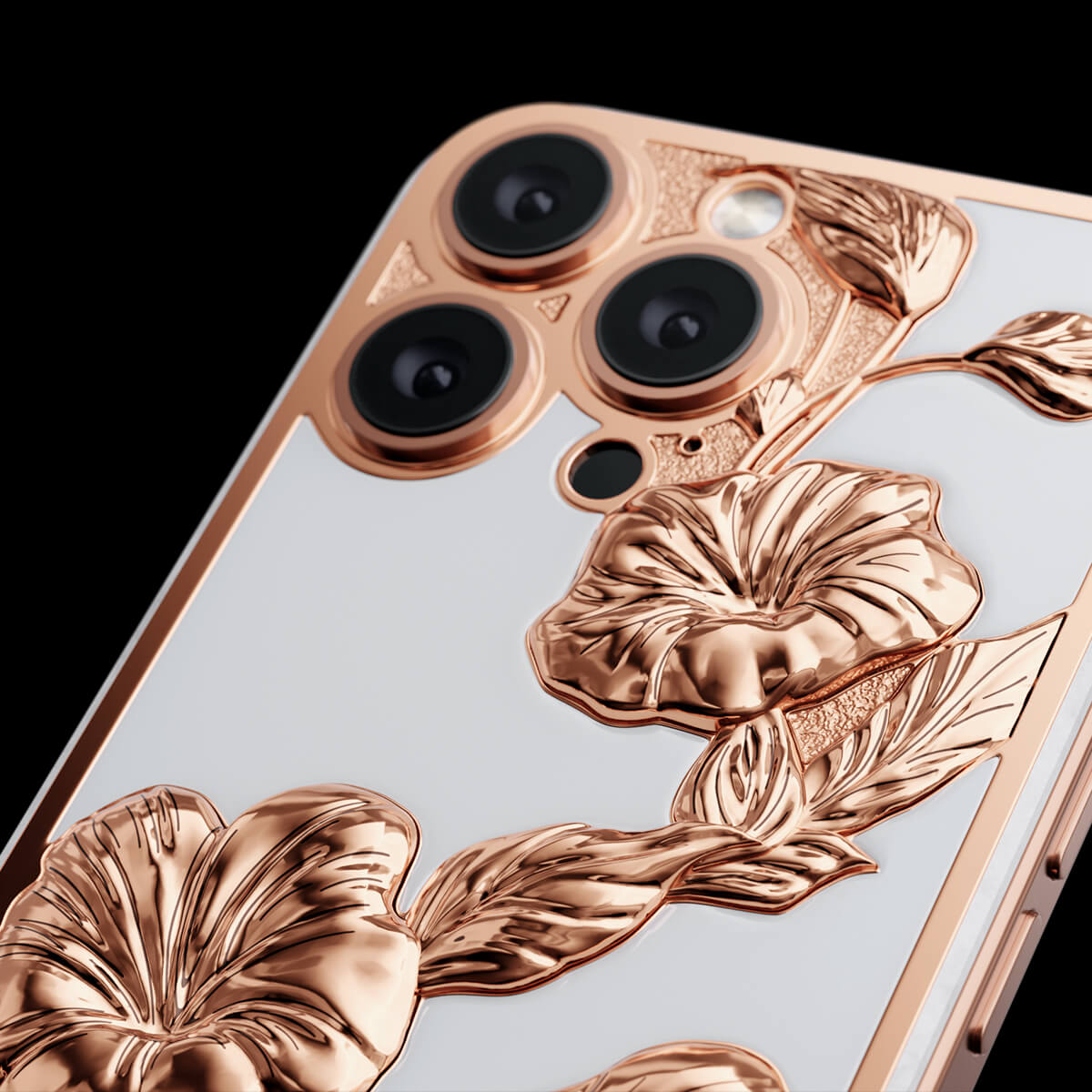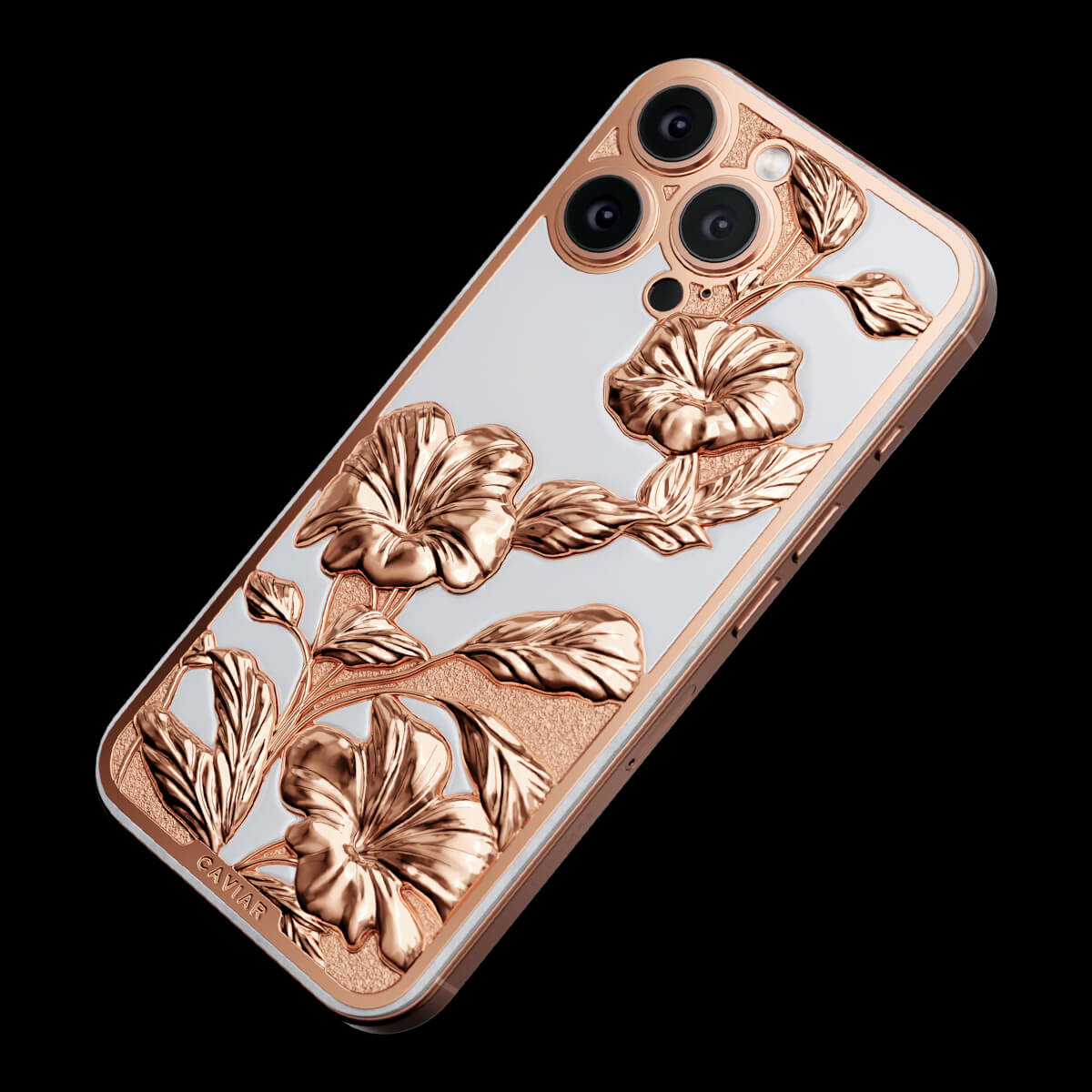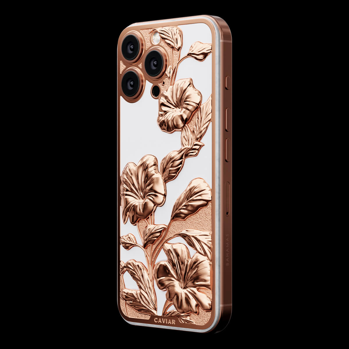 Caviar embodied the beauty of this tropical paradise in the design of a custom iPhone. The device's snow-white background is made from stone, resembling the sandy shores of the islands, while delicate floral patterns capture the fullness of the tropical flora. The pink gold framing adds warmth, echoing the sunsets reflected in the water.
