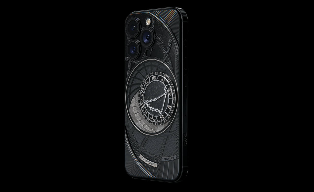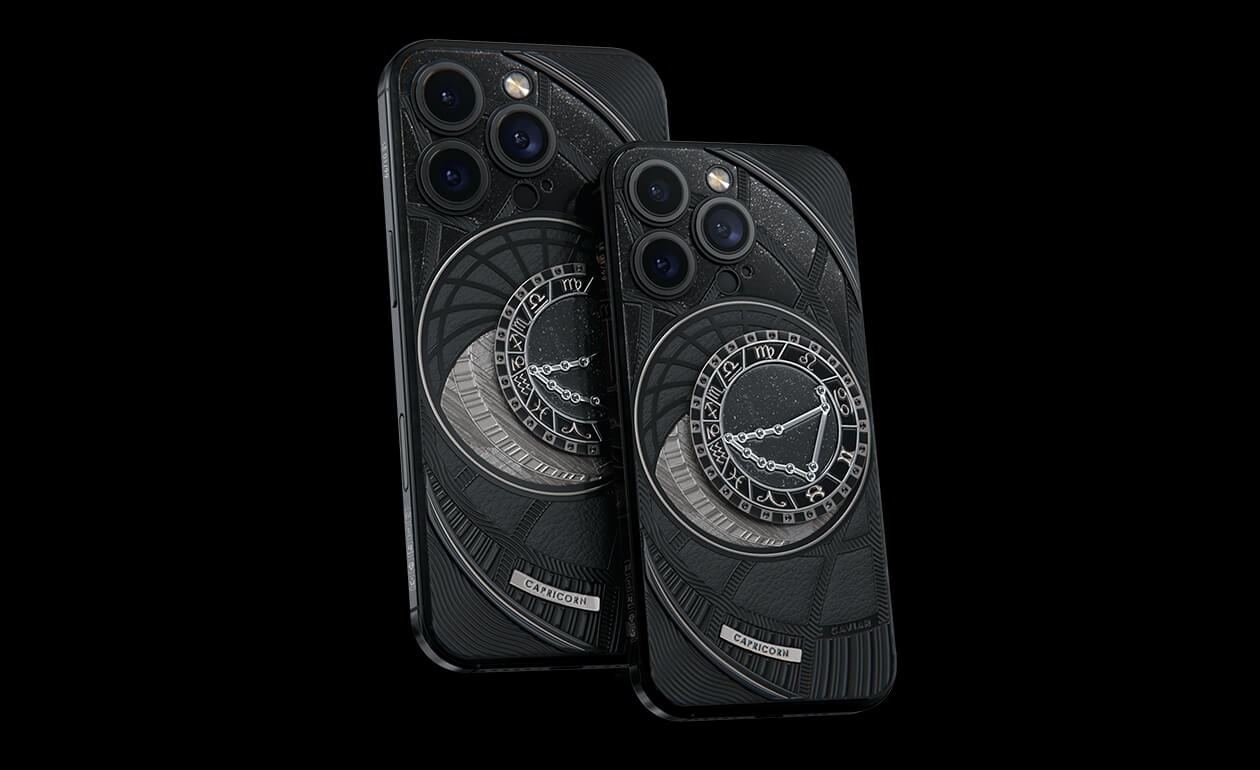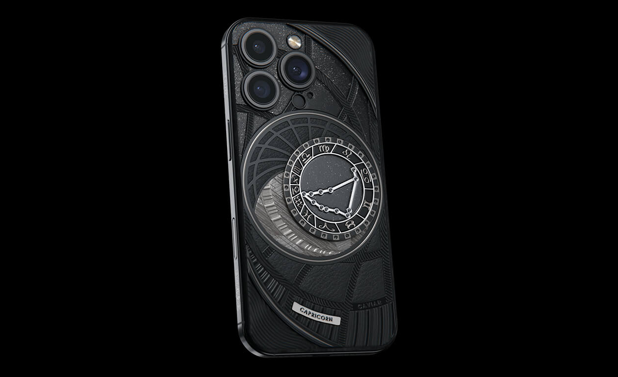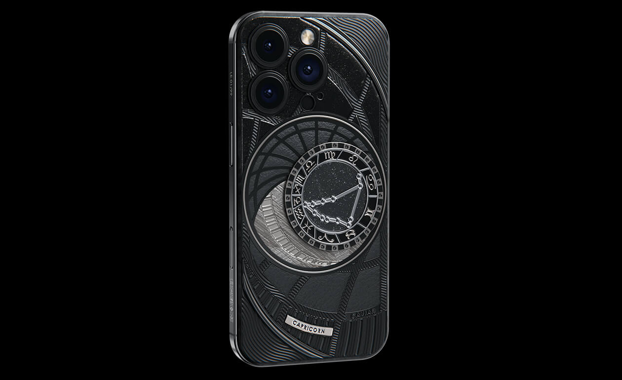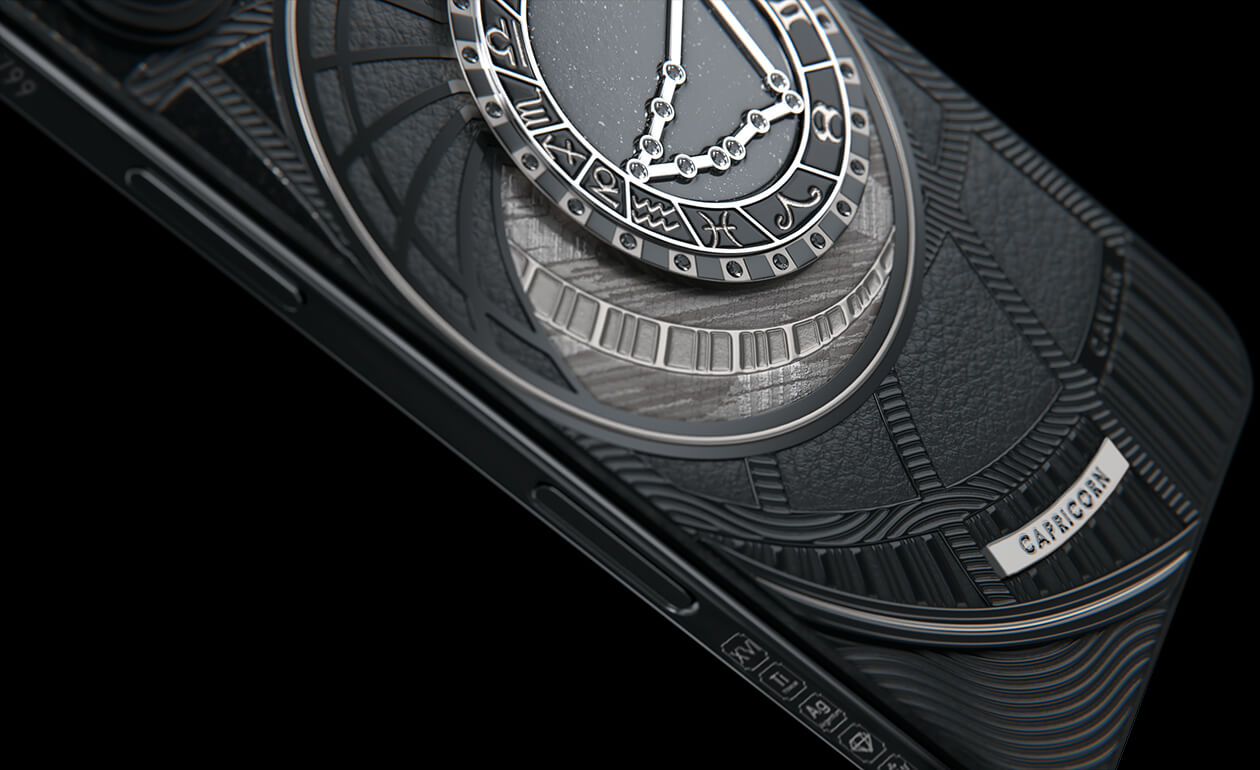 Capricorns, today we present to you Capricorn. Your smartphone has a sky vault with your stars on it. This is a panel of 24 black zirconia, created on titanium with a PVD coating. We highlighted the shine of the black diamond plaque with an black composite and finished the composition with a meteorite fragment on classic black calf leather.