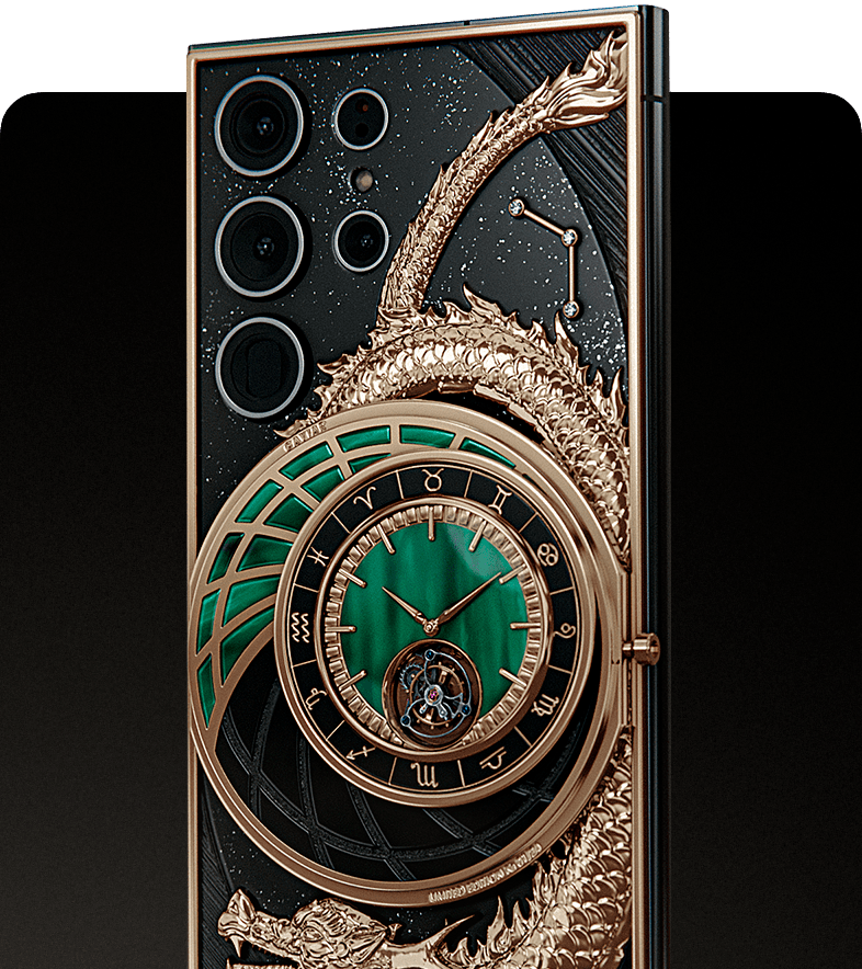 Indulge in the harmony of details - Caviar mechanical watch with a tourbillon and a green dial, voluminous dragon bas-relief, zodiac circle coated with 24-karat gold, a diamond constellation, reminiscent of Samsung's history. Only 24 pieces available worldwide.