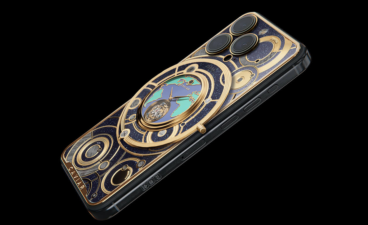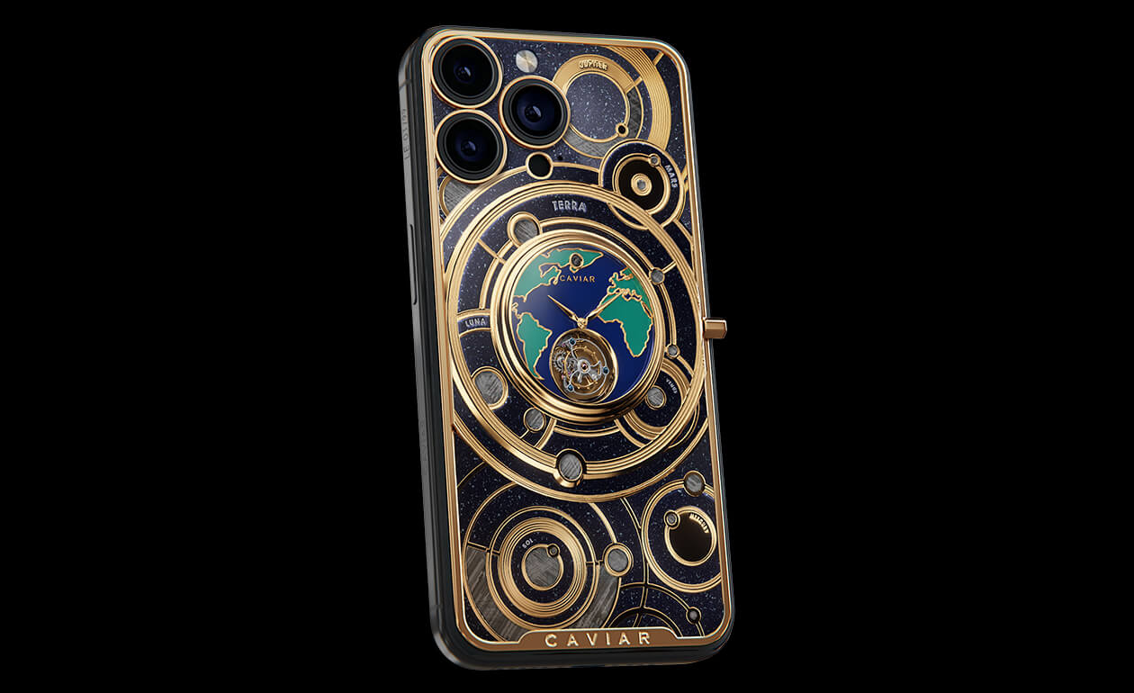 At the core, there is so well-loved iPhone design with a tourbillon watch. The fascinating tourbillon rotation accurately reflects the specifics of the planets’ movement in the orbit. The exaggerated cyclicity enclosed in the endless gold circles seems to convey the very essence of the space nature: the endless movement of many system elements.