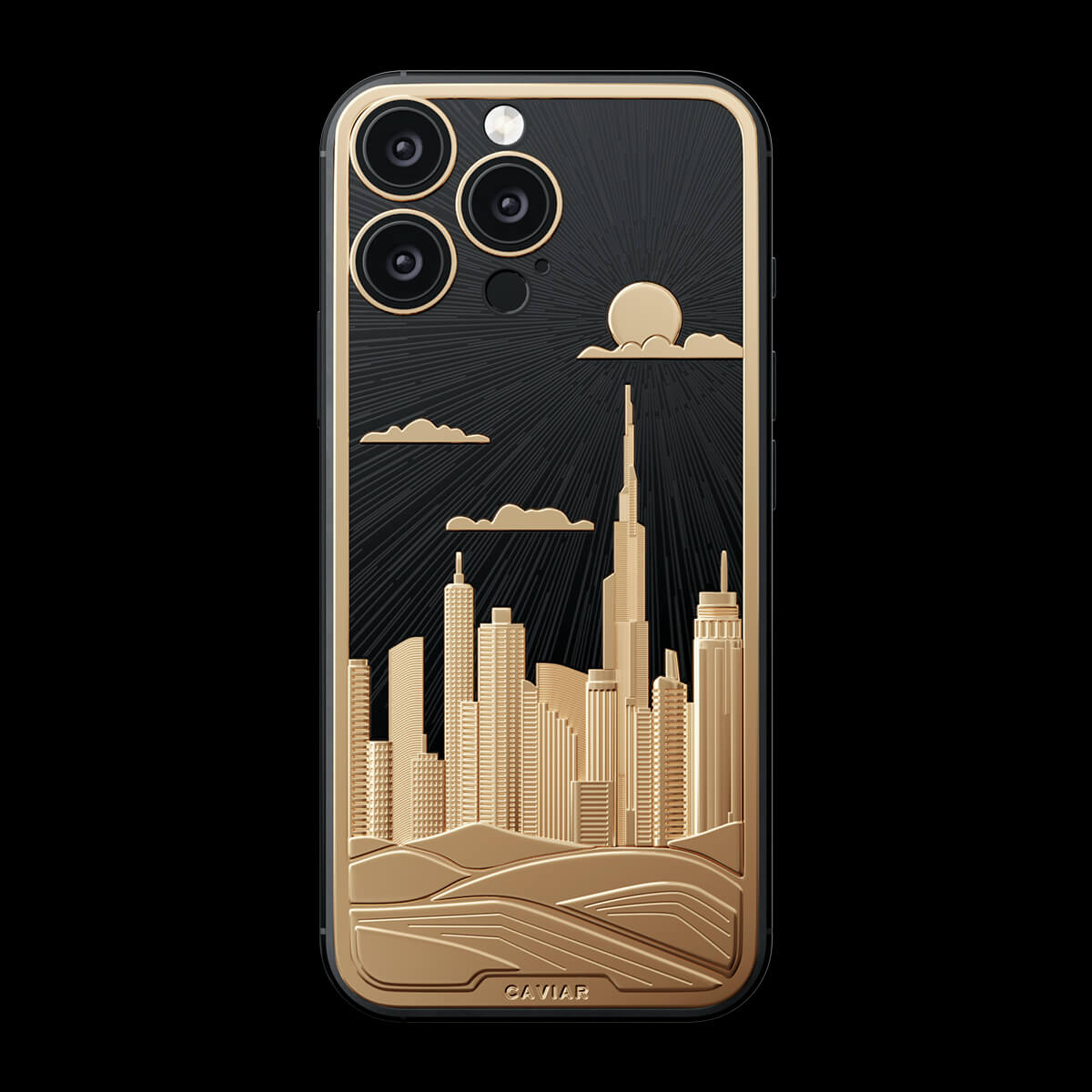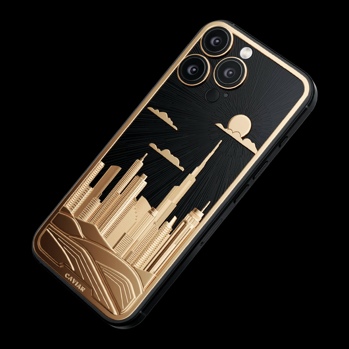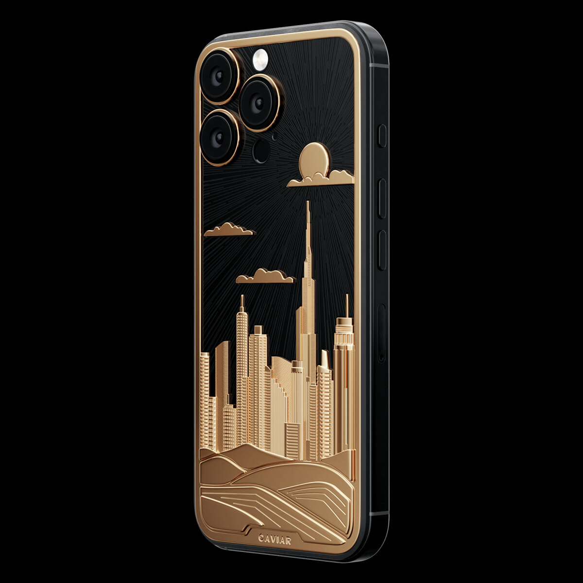 Caviar captured the grandeur of this Middle Eastern marvel on the iPhone case: a luxurious three-dimensional panorama, coated in 24-karat gold, featuring the silhouettes of the Burj Khalifa and other skyscrapers — symbols of exclusivity and grandeur. The engraving conveys the play of light and shadow, creating an effect of depth and movement.