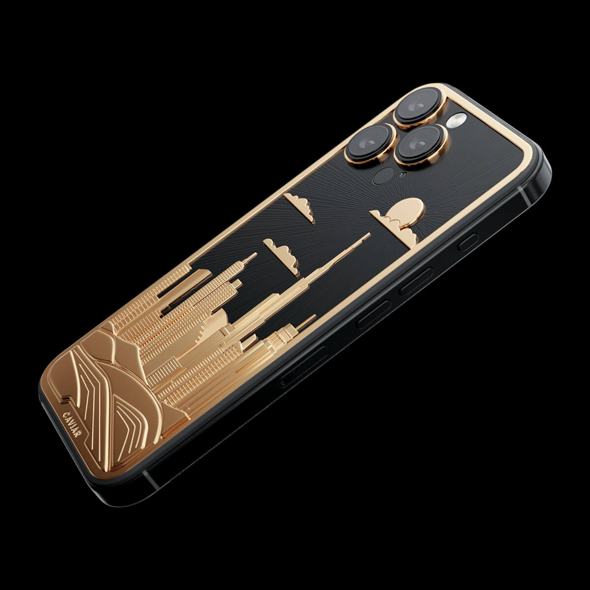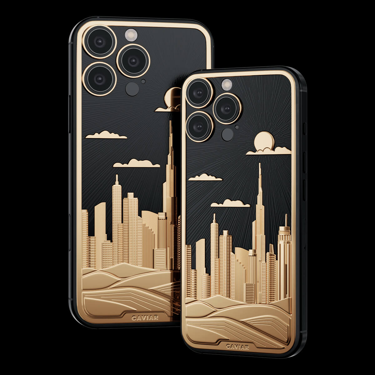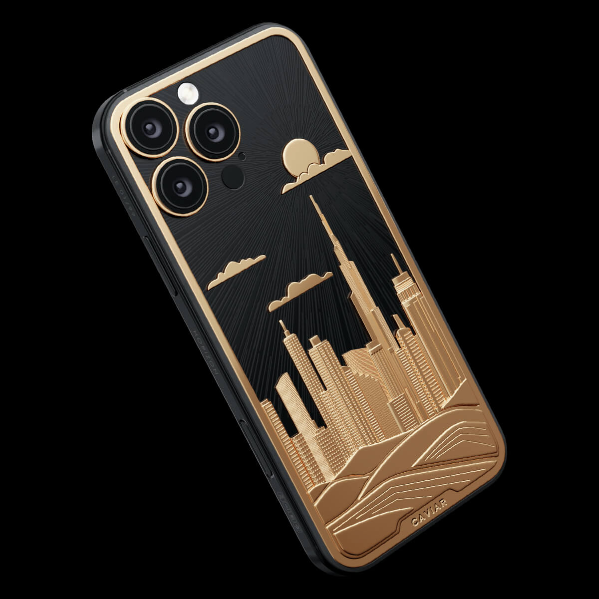 Caviar captured the grandeur of this Middle Eastern marvel on the iPhone case: a luxurious three-dimensional panorama, coated in 24-karat gold, featuring the silhouettes of the Burj Khalifa and other skyscrapers — symbols of exclusivity and grandeur. The engraving conveys the play of light and shadow, creating an effect of depth and movement.