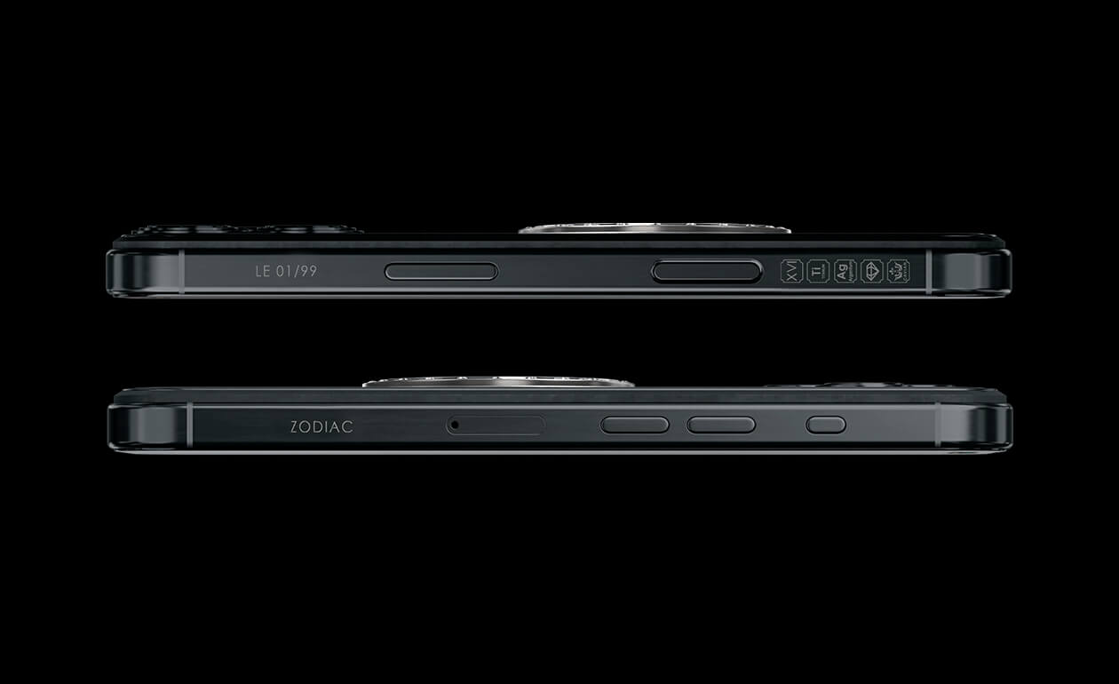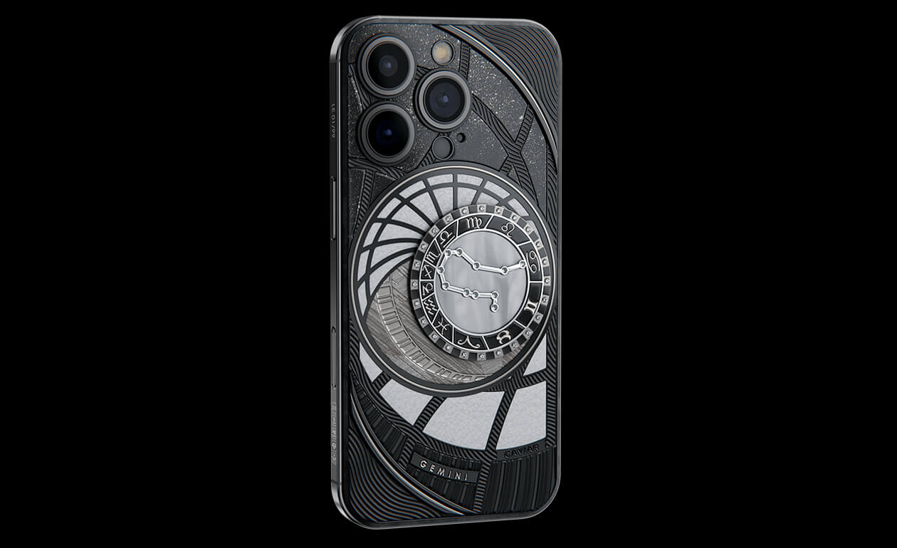 Geminis, today we present to you the Gemini. Your smartphone has a sky vault with your stars on it. This is a panel of 24 Swarovski crystals, created on black titanium with a PVD coating. We highlighted the shine of the crystal placer with a white composite plate and finished the composition with a meteorite fragment on white calf leather.