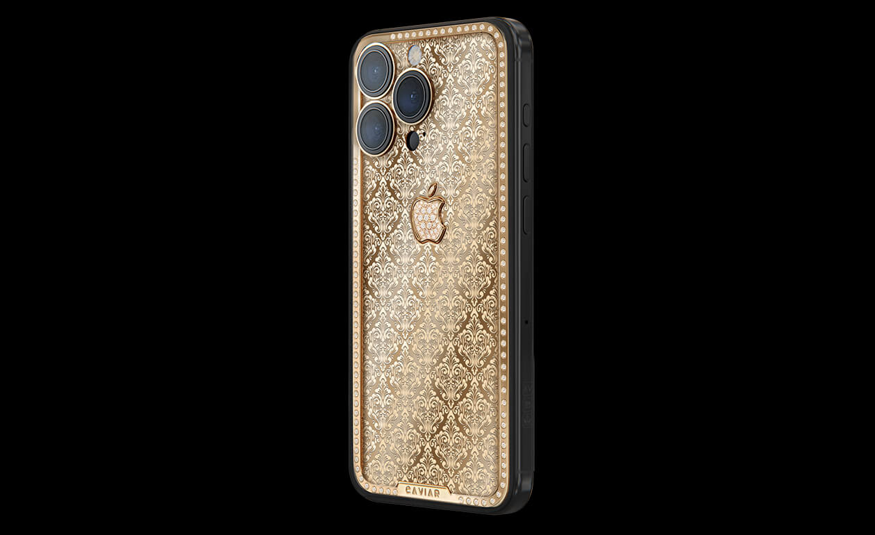 Exquisite design with hints of Swiss luxury watchmaking. Caviar adorned the iPhone case with a scattering of royal crowns. The panel on the golden case is complemented by a magnificent golden apple. The pure radiance of epochal greatness embodied in the most advanced device.
