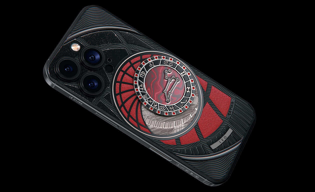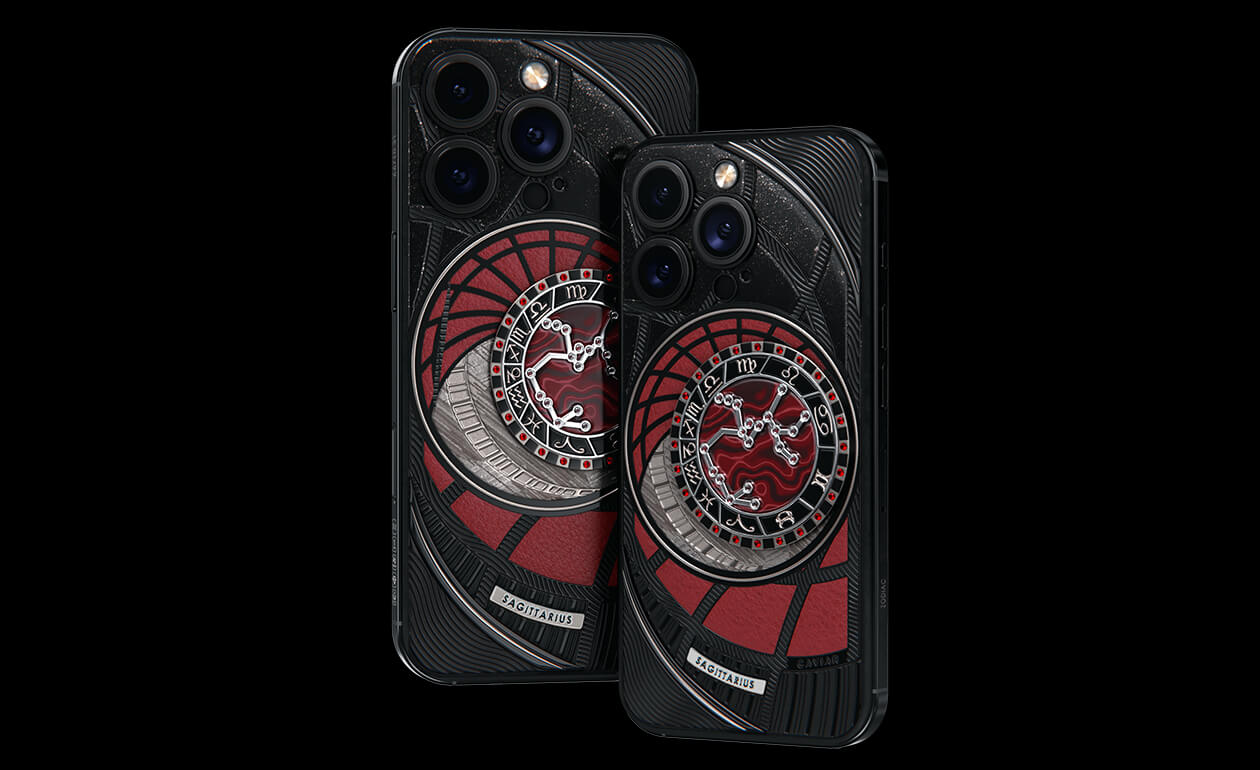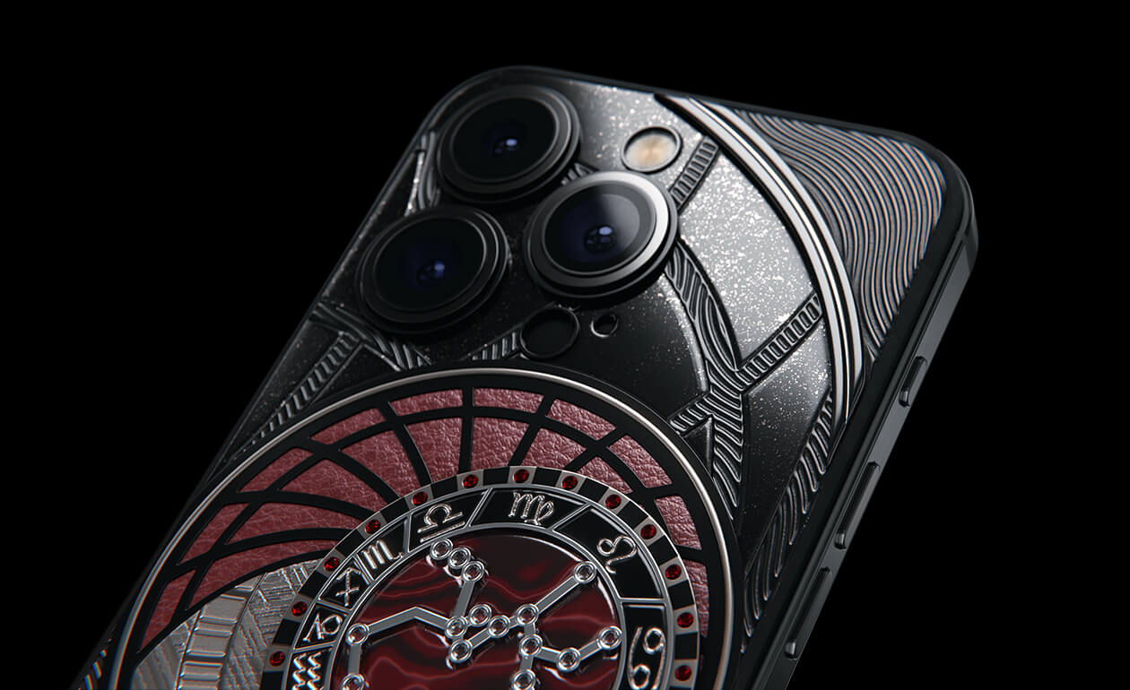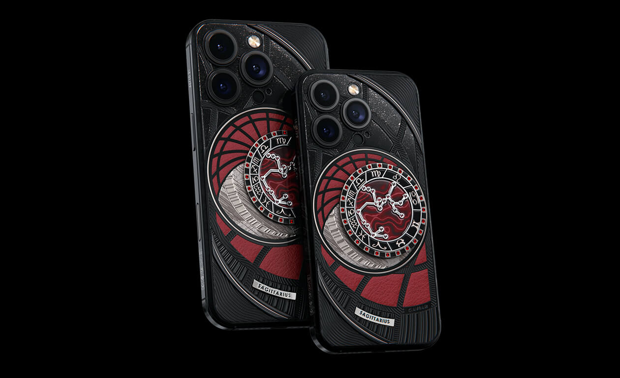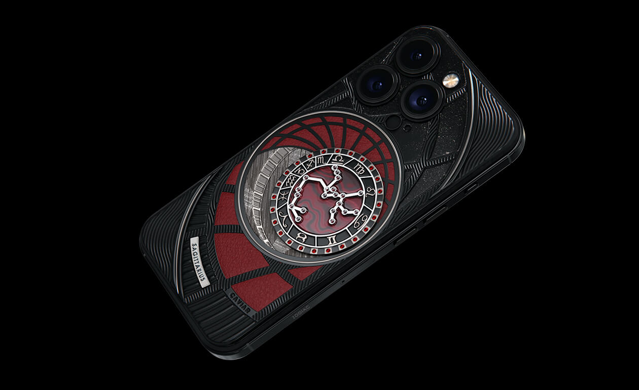 Sagittariuses, today we present to you Sagitarius. Your smartphone has a sky vault with your stars on it. This is a panel of 24 rubies, created on black titanium with a PVD coating. We emphasized the glow of the ruby placer with a plate of red composite and finished the composition with a fragment of a meteorite on calfskin in a bright carmine shade.
