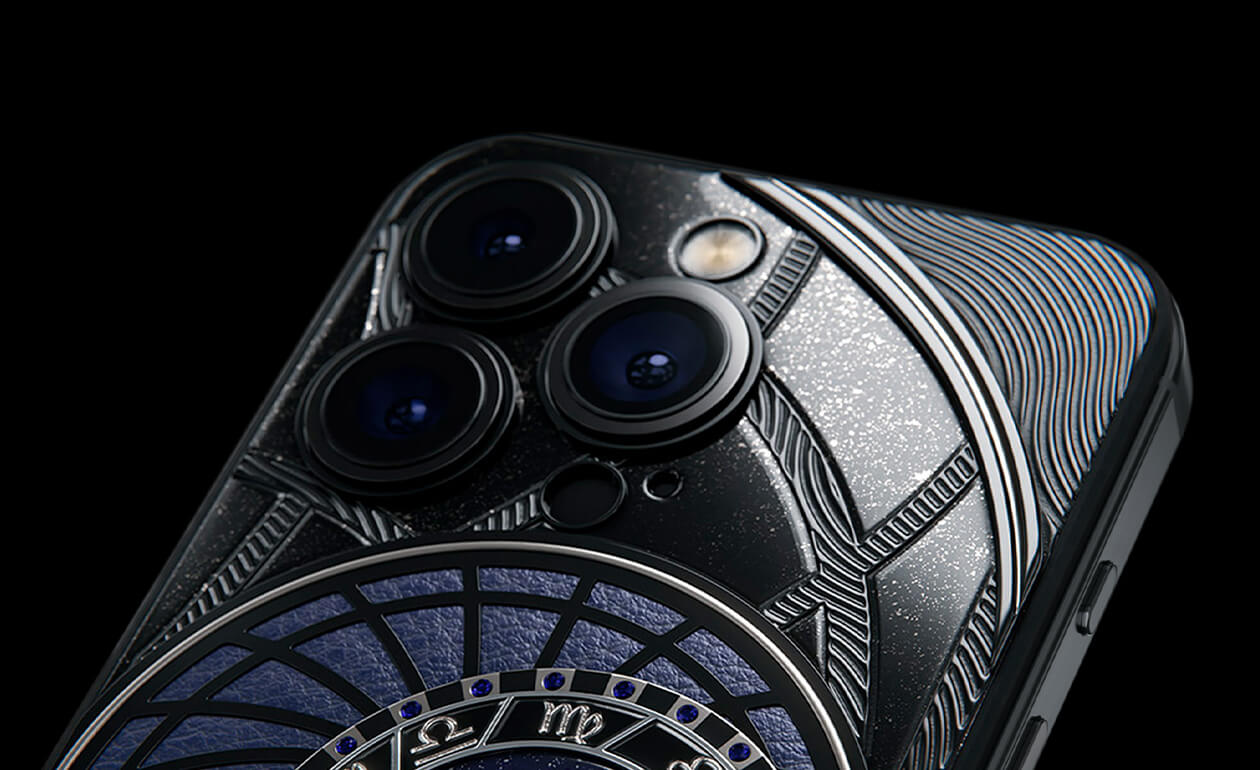Scorpios, today we present to you Scorpio 16 Pro. Your smartphone has a sky vault with your stars on it. This is a panel of 24 sapphires, created on black titanium with a PVD coating. We emphasized the shine of the sapphire placer with an blue composite plate and finished the composition with a fragment of a meteorite on calfskin in a bright shade of indigo.