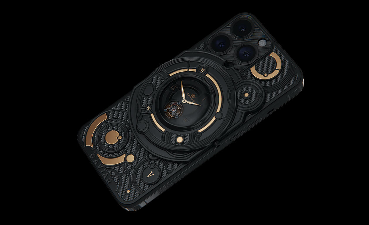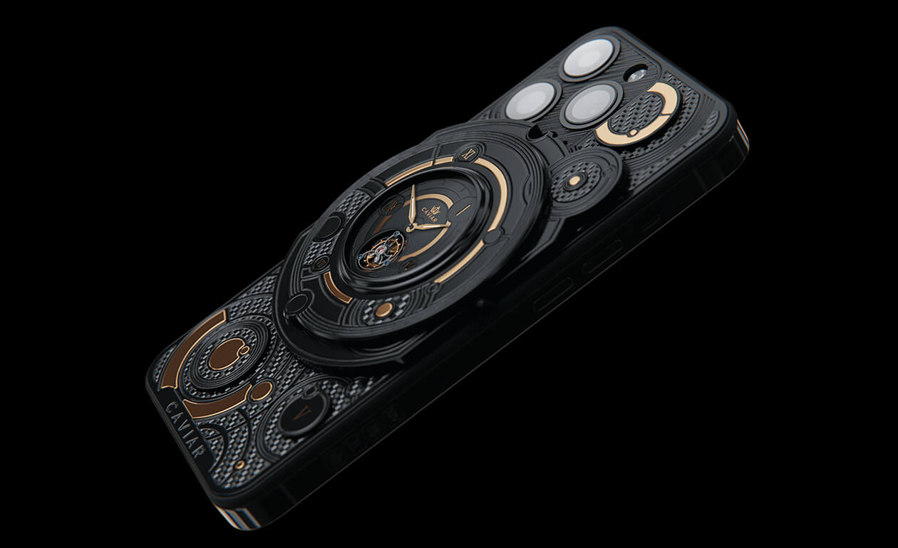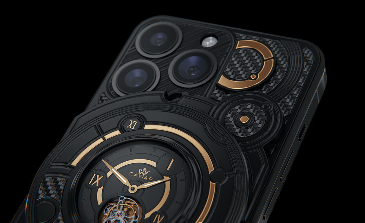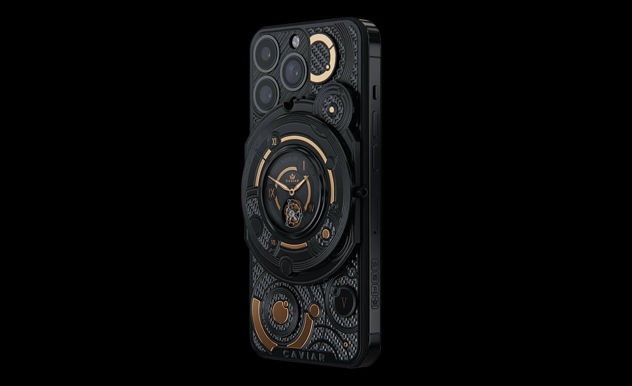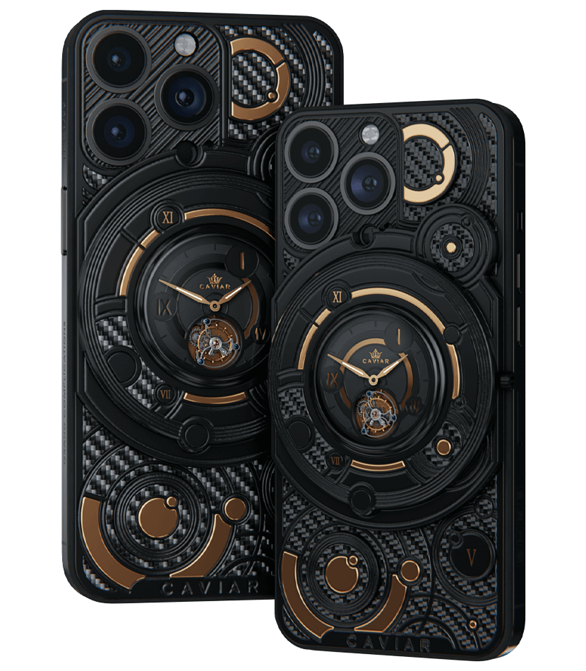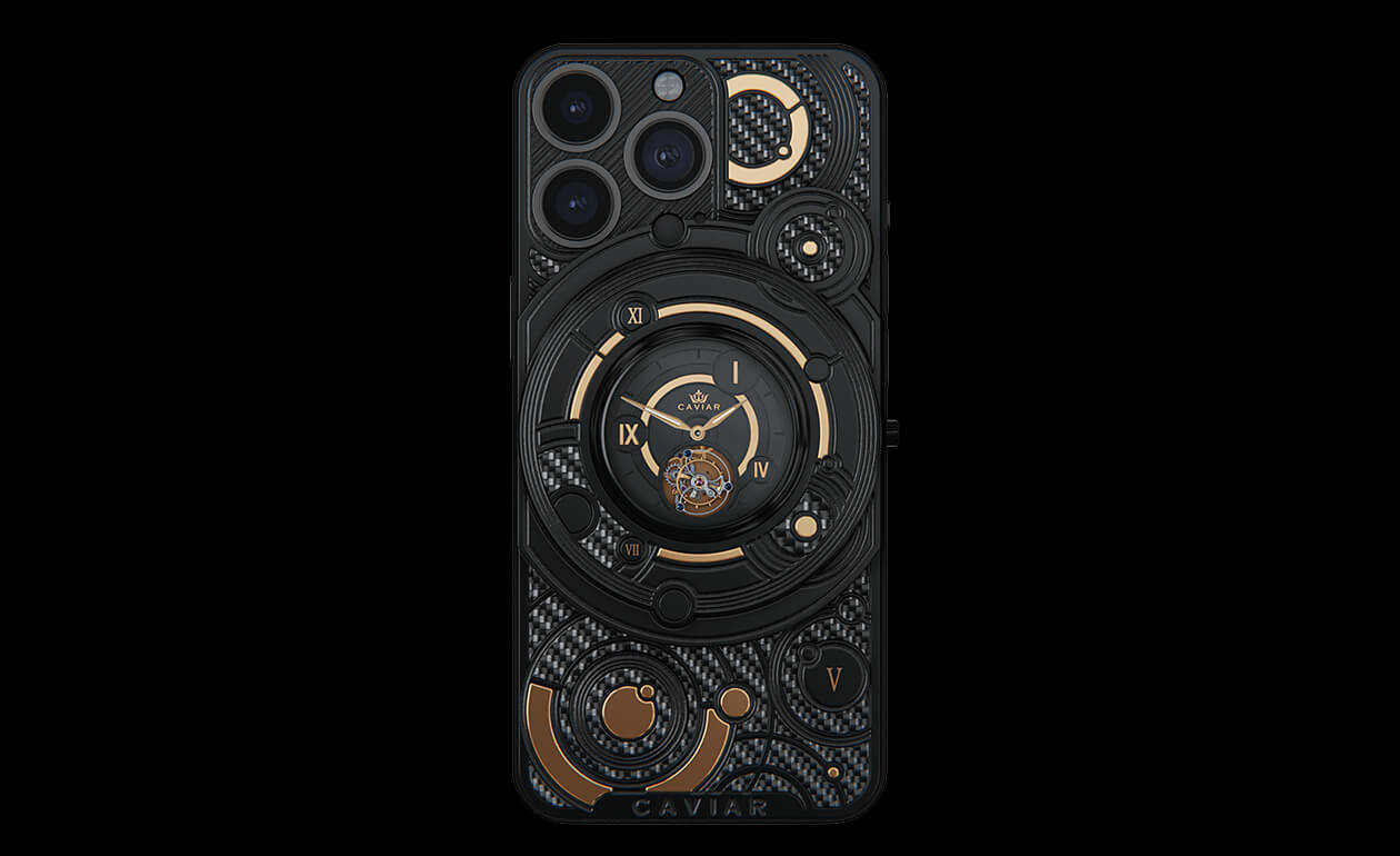 We fused an innovative smartphone with the mechanics of classical watchmaking by integrating a tourbillon into the body. This complication counters the effects of gravity to enhance timekeeping accuracy—and Caviar was the first to bring such a hybrid to the world of smartphones. The design is powerful yet refined: carbon and titanium, a deep black PVD finish, and gold accents that heighten contrast and underscore the idea of absolute precision. The result is a contemporary, self-assured object for those who truly value time.