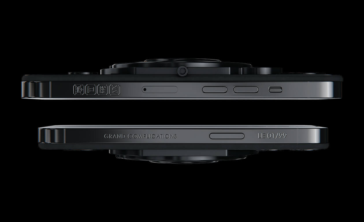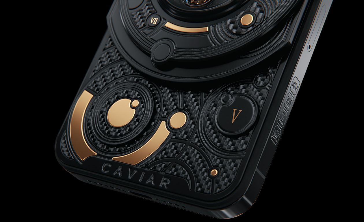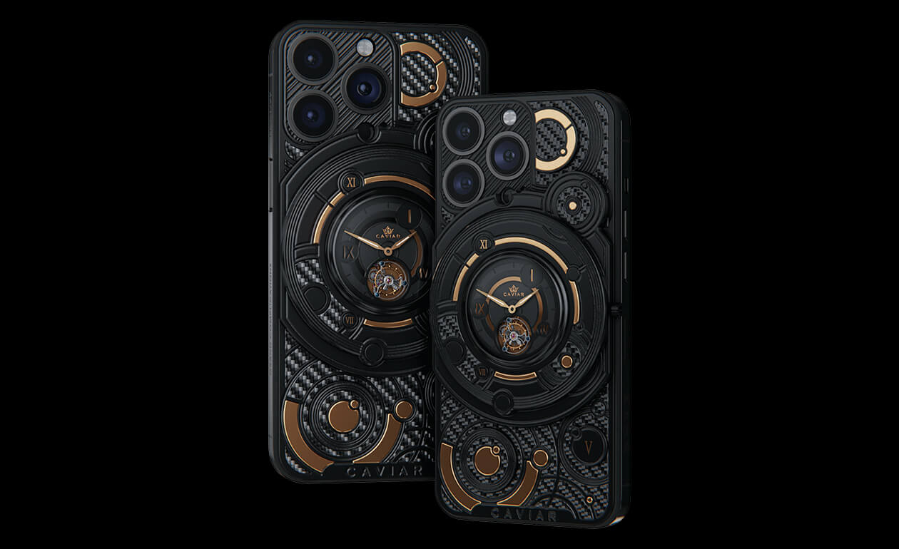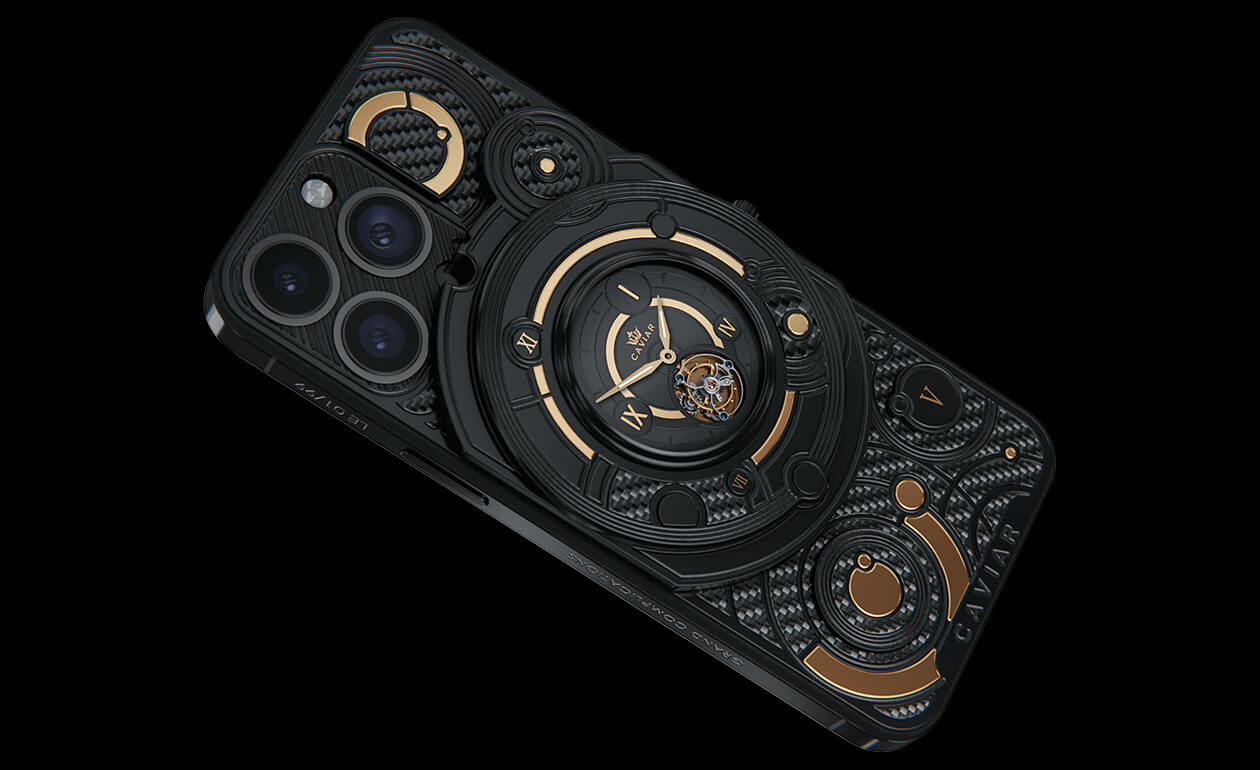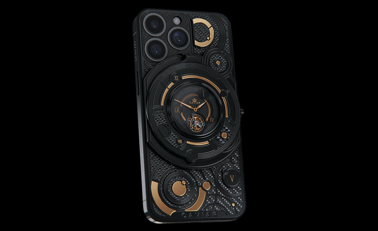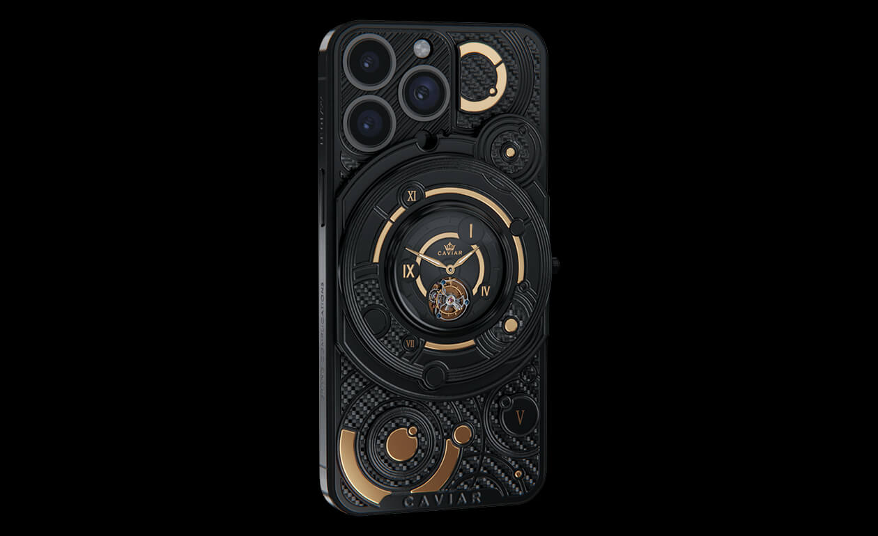 We fused an innovative smartphone with the mechanics of classical watchmaking by integrating a tourbillon into the body. This complication counters the effects of gravity to enhance timekeeping accuracy—and Caviar was the first to bring such a hybrid to the world of smartphones. The design is powerful yet refined: carbon and titanium, a deep black PVD finish, and gold accents that heighten contrast and underscore the idea of absolute precision. The result is a contemporary, self-assured object for those who truly value time.