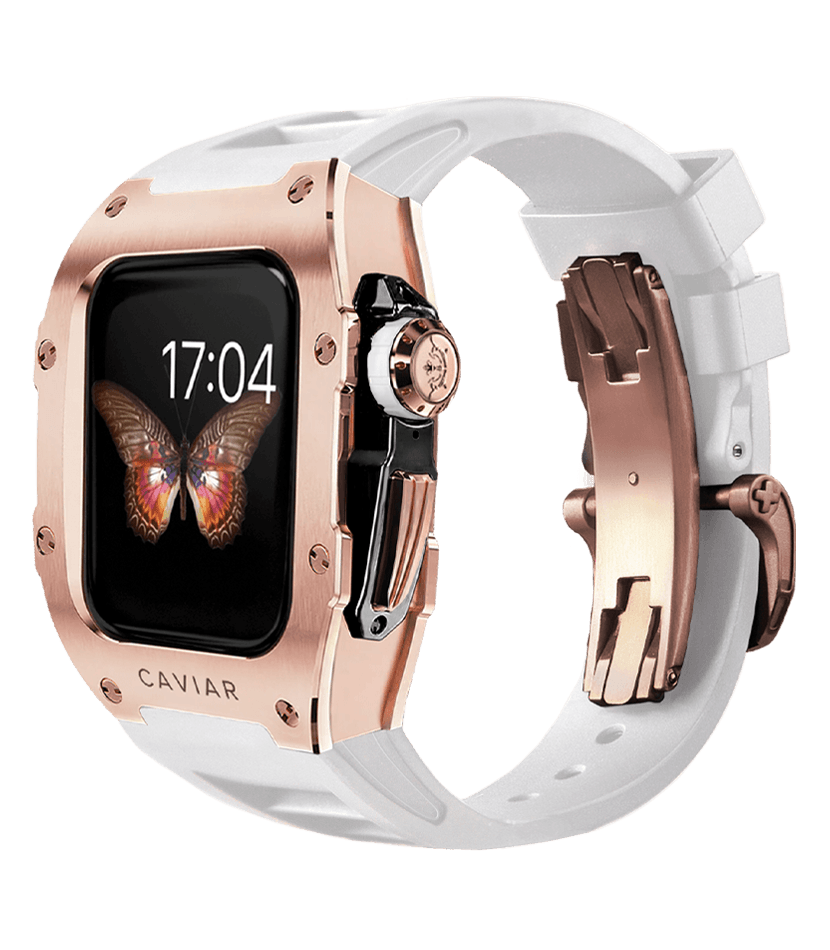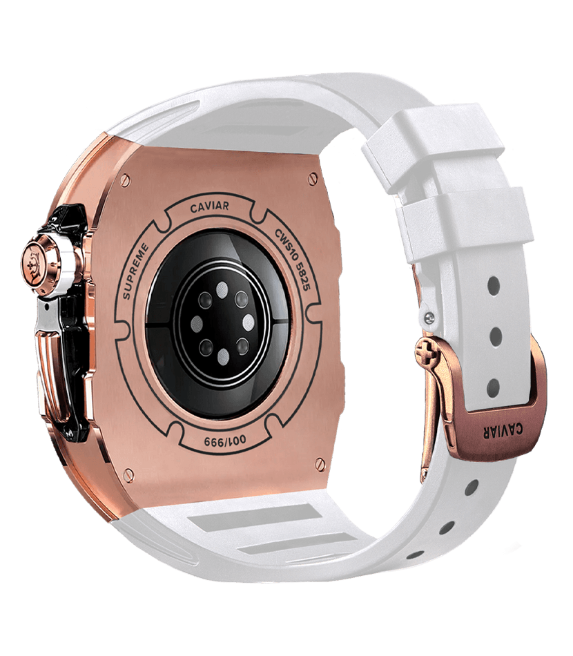 Strap: A textured white rubber strap with a double-folding clasp. The clasp is finished with a rose gold PVD coating, adding a touch of sophistication to every detail.
