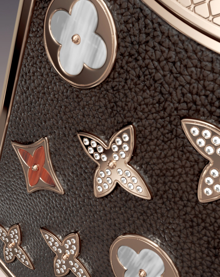 A tribute to the heritage of Louis Vuitton and its iconic floral motifs, reimagined through the warm palette of caramel tones. Gold-plated jewelry elements form a delicate composition that radiates warmth and emotional depth. Premium caramel-chocolate leather is paired with subtle white and red accents, adding contrast and personality.