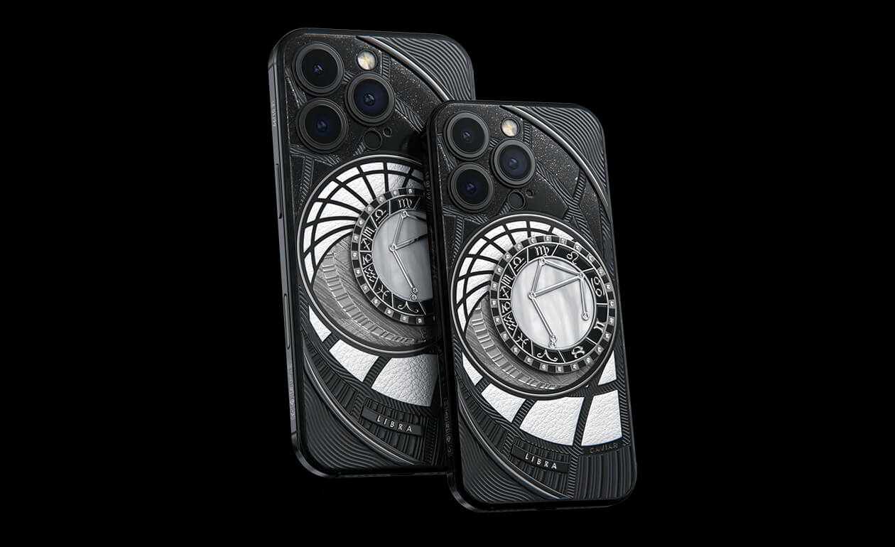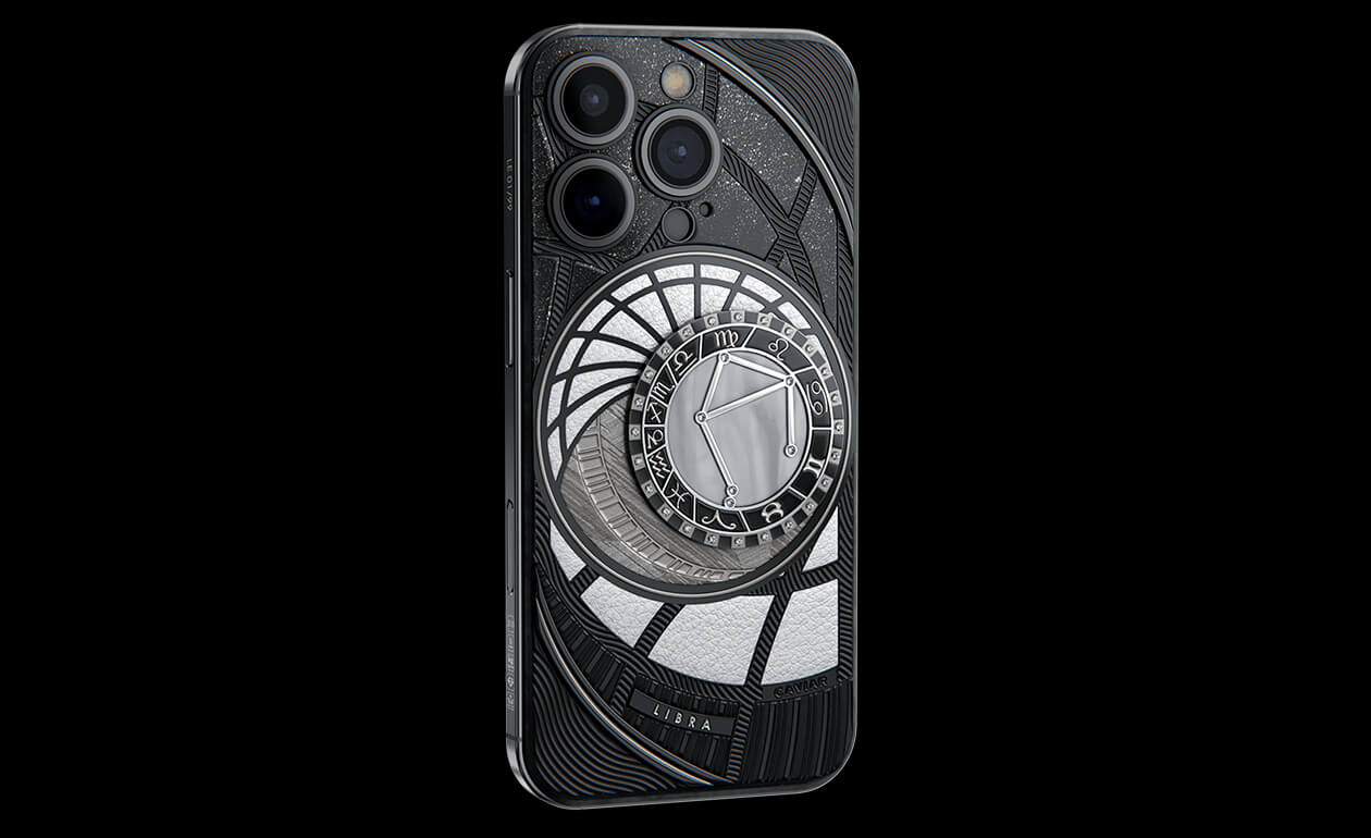 Libras, today we present to you Libra. Your smartphone has a sky vault with your stars on it. This is a panel of 24 Swarovski crystals, created on black titanium with a PVD coating. We highlighted the shine of the crystal placer with a white composite plate and finished the composition with a meteorite fragment on white calf leather.