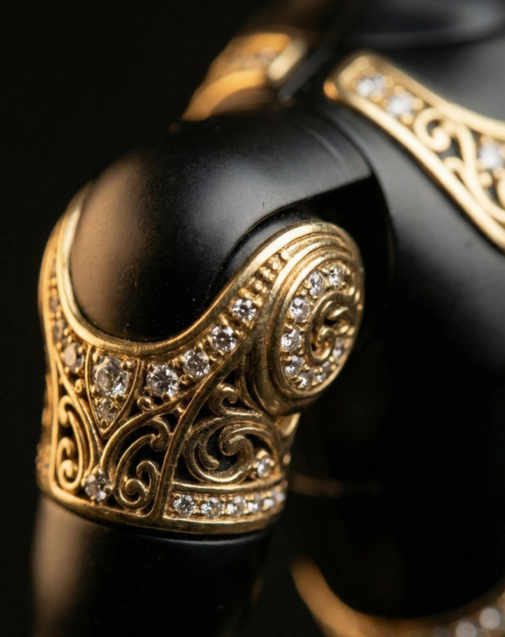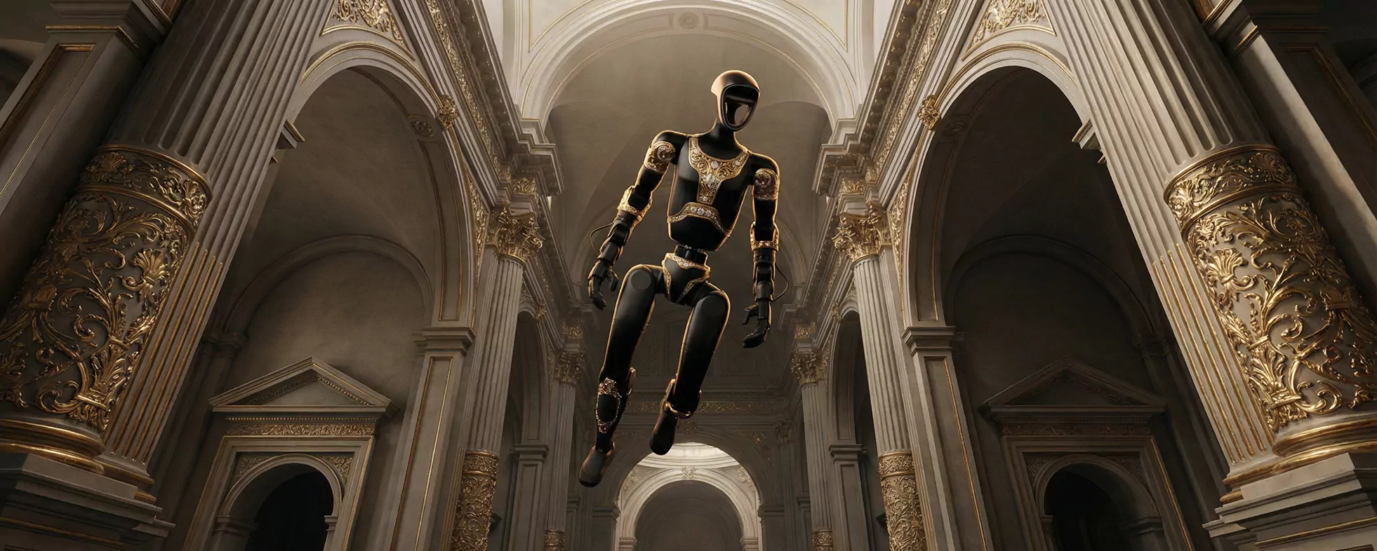 Aladdin captivates at first glance, uniting futurism with Eastern decorative tradition. Its body is finished in deep black and adorned with delicate gilded patterns. Arabesques and ornamental motifs cover the panels and joints, giving the robot the appearance of a luxurious artifact that guards an ancient secret. Black symbolizes depth and the infinity of knowledge, while gold represents power, wisdom, and value. In motion, the gilding shimmers softly, creating the impression of a living treasure from an Eastern legend.
