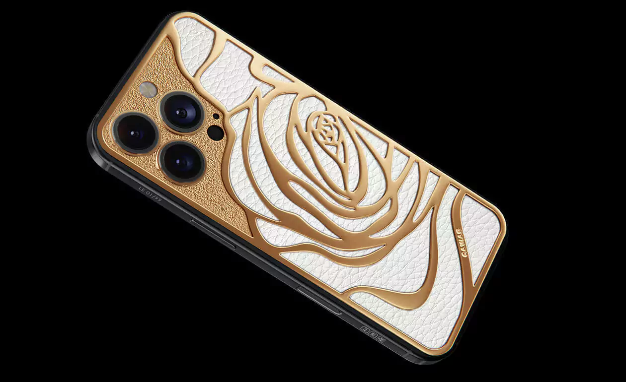 Golden Rose by Caviar embodies a sincere declaration of love. Our shining rose is made of jewelry alloy, covered with a double layer of 24K gold, and white calfskin. The smartphone is based on the gold version of the iPhone 16 Pro.